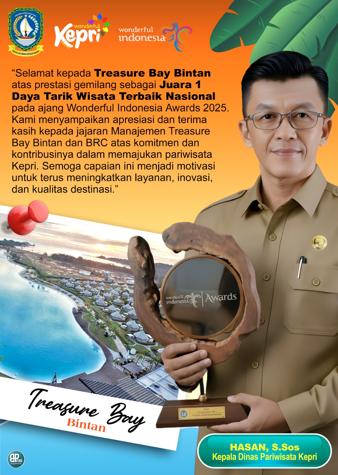 Di antara berbagai kategori penghargaan malam itu, sorotan bagi Kepulauan Riau jatuh pada kemenangan Treasure Bay Bintan sebagai Juara 1 Daya Tarik Wisata Terbaik Nasional. Penghargaan tersebut menjadi capaian membanggakan sekaligus menegaskan posisi Bintan sebagai destinasi wisata unggulan Indonesia.