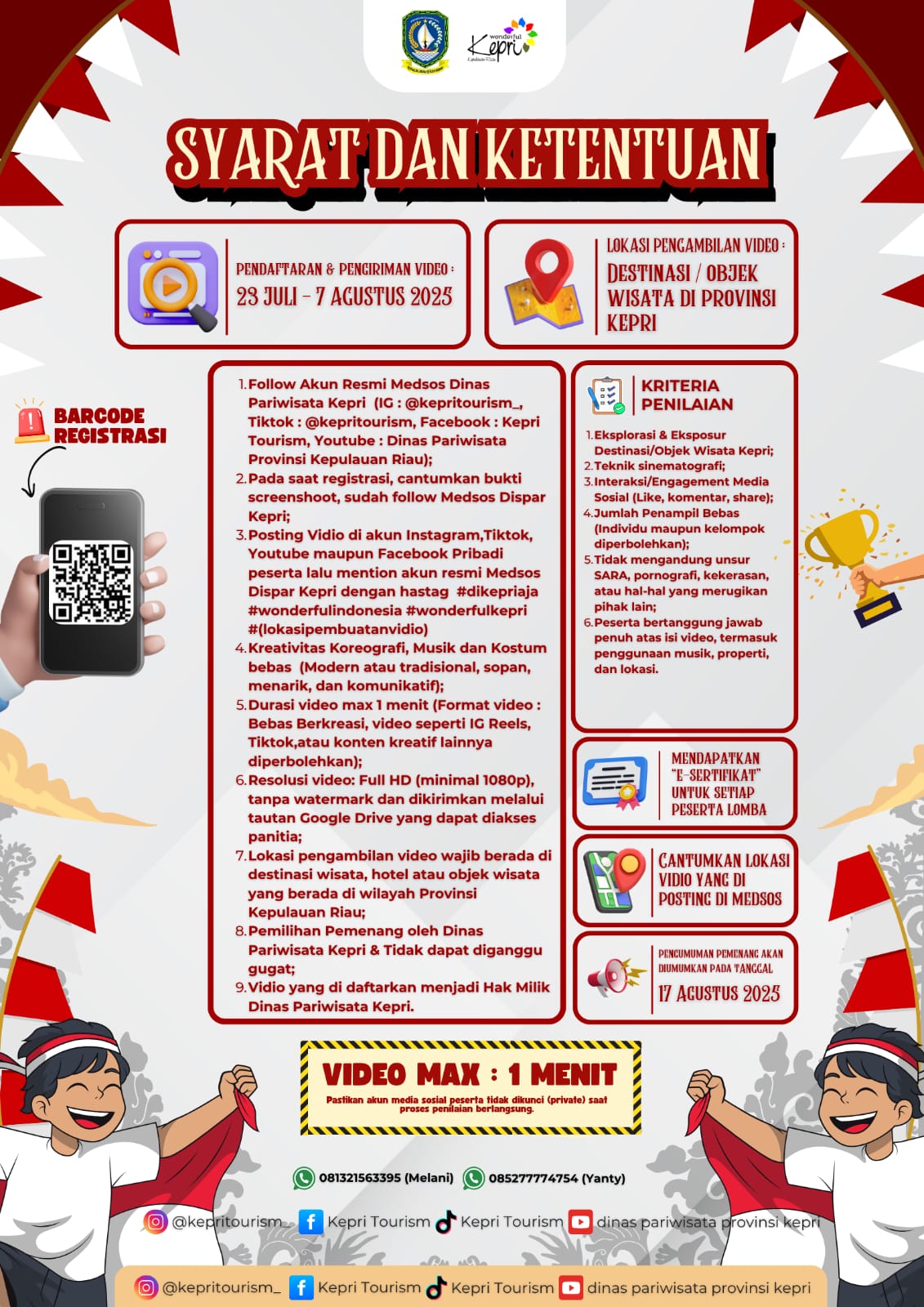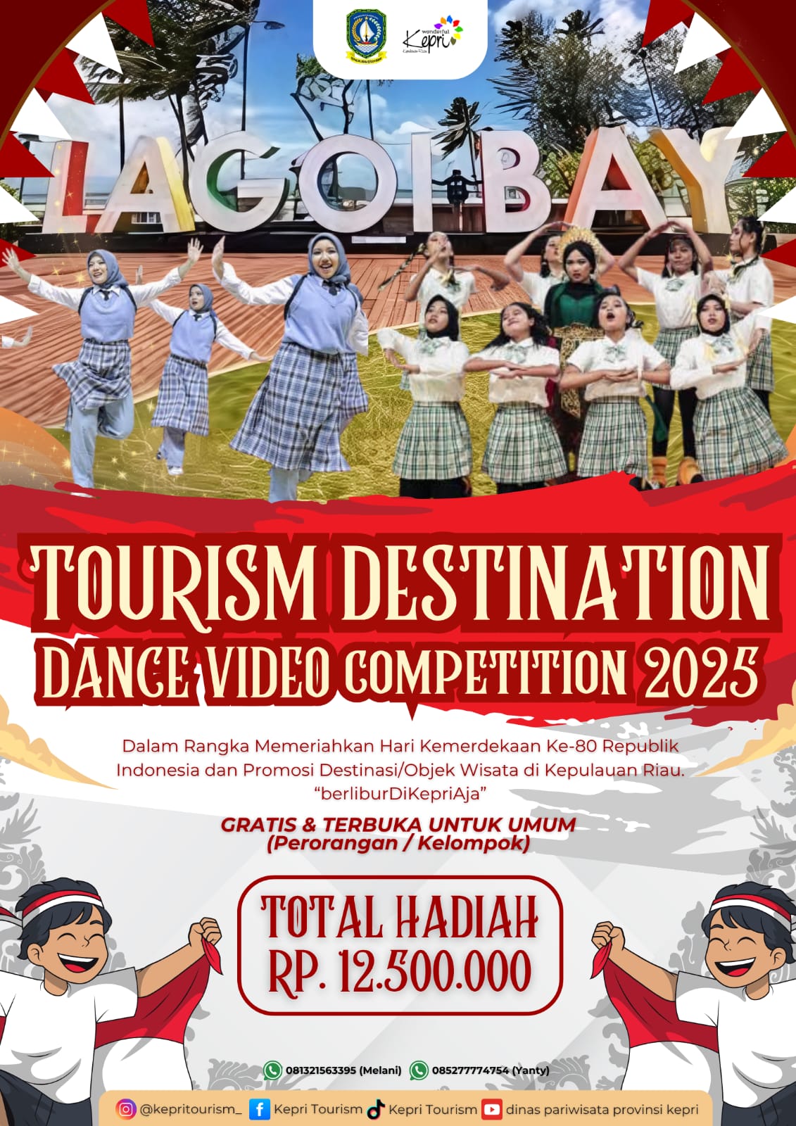 Tanjung Pinang - Dinas Pariwisata Provinsi Kepulauan Riau menggelar Tourism Destination Dance Video Competition 2025 sebagai bagian dari rangkaian perayaan Hari Kemerdekaan ke-80 Republik Indonesia. Mengusung tagline #BerliburDiKepriAja, kompetisi ini terbuka untuk umum, baik perorangan maupun kelompok, tanpa dipungut biaya pendaftaran, dan memperebutkan total hadiah sebesar Rp 12.500.000.