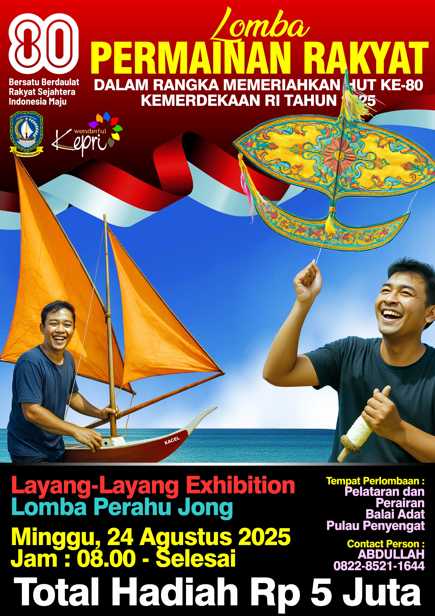 Pulau Penyengat – Dalam rangka memeriahkan Hari Ulang Tahun ke-80 Kemerdekaan Republik Indonesia, Dinas Pariwisata Provinsi Kepulauan Riau menggelar Lomba Permainan Rakyat yang akan berlangsung pada Minggu, 24 Agustus 2025 mulai pukul 08.00 WIB hingga selesai, berlokasi di pelataran dan perairan Balai Adat Pulau Penyengat.