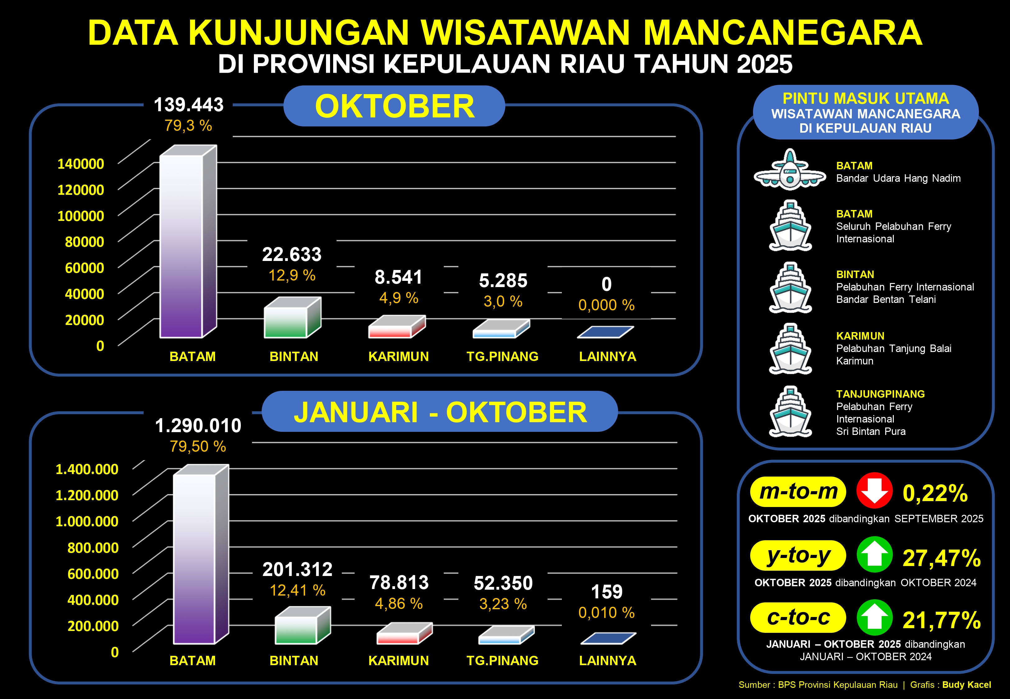 TANJUNGPINANG - Kepulauan Riau (Kepri) menunjukkan performa pariwisata yang semakin positif pada Oktober 2025, menandai kebangkitan optimisme di sektor strategis ini. Berdasarkan data resmi Badan Pusat Statistik (BPS) Provinsi Kepulauan Riau, jumlah kunjungan wisatawan mancanegara (wisman) mencapai 175.902 kunjungan. Angka ini adalah sebuah prestasi yang membanggakan, mencatat kenaikan signifikan sebesar 27,47 persen dibandingkan bulan yang sama tahun sebelumnya (Oktober 2024). Lonjakan tahunan yang kuat ini adalah indikator nyata dari daya pikat dan pemulihan pariwisata Kepri di mata dunia.