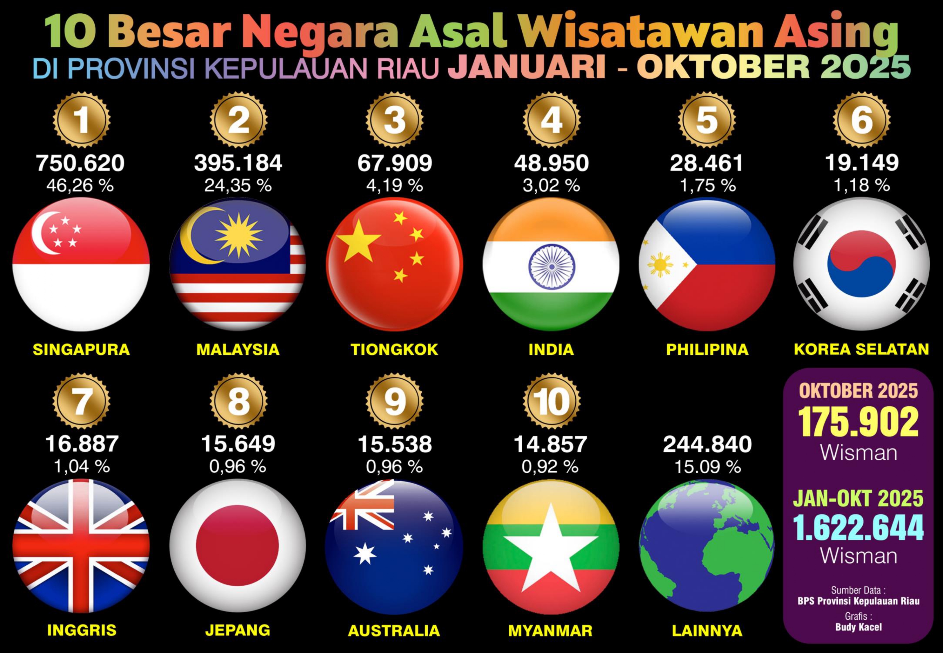Wisman dari Singapura terus menjadi penyumbang terbesar dengan 81.244 kunjungan, mendominasi hingga 46,19 persen dari total kunjungan. Disusul oleh Malaysia dengan 42.626 kunjungan (24,23 persen).