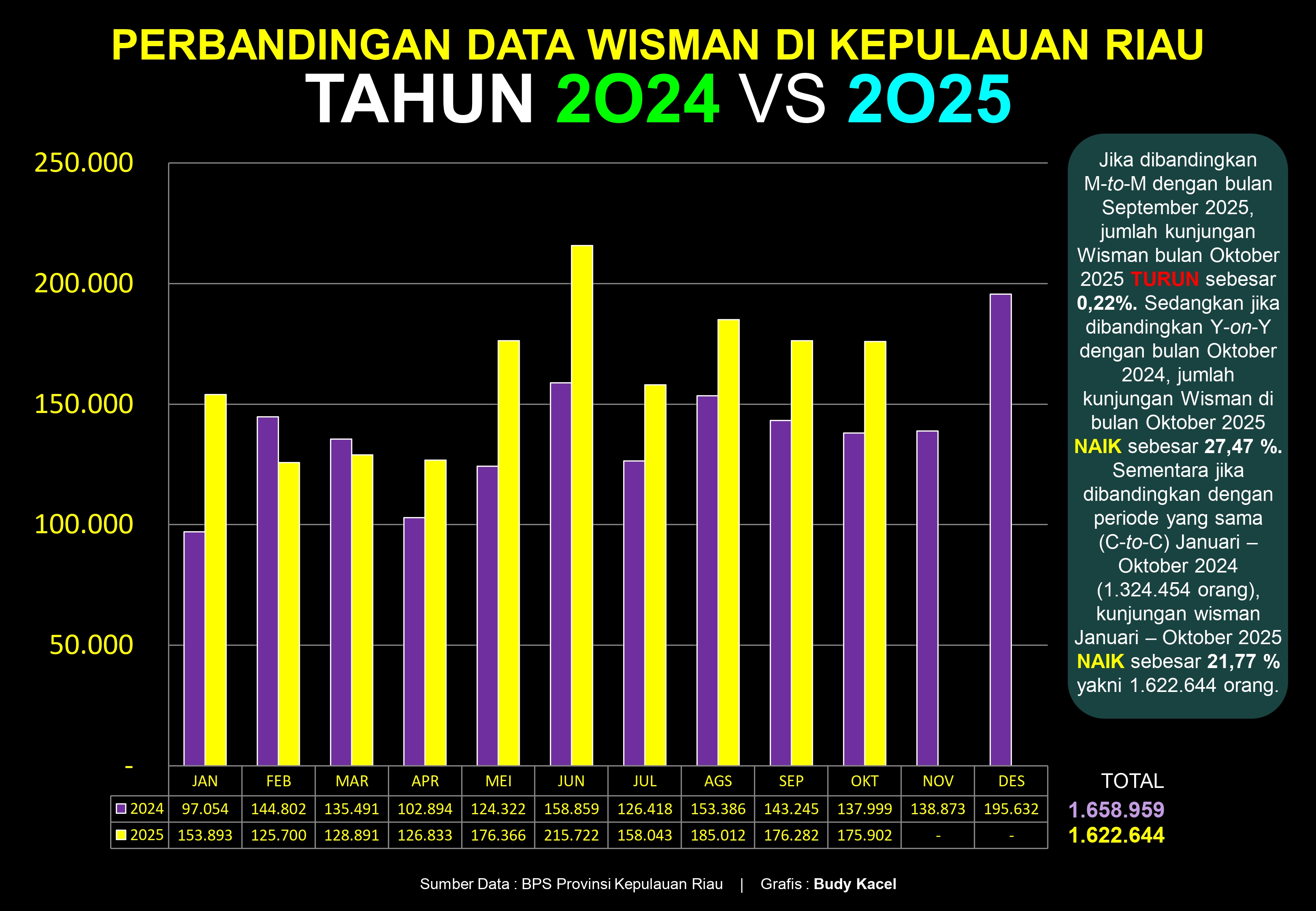 Meskipun secara bulanan (dibandingkan September 2025) terjadi sedikit koreksi tipis sebesar 0,22 persen , BPS Kepri memberikan penjelasan detail yang justru memperkuat optimisme. Penurunan ini disebabkan terutama oleh menurunnya jumlah kunjungan wisman ke Kota Batam sebesar 1,77 persen. Karena Batam merupakan pintu masuk utama dengan kontribusi hampir 80 persen dari total wisman, penurunan kecil di Batam ini sangat memengaruhi angka total.