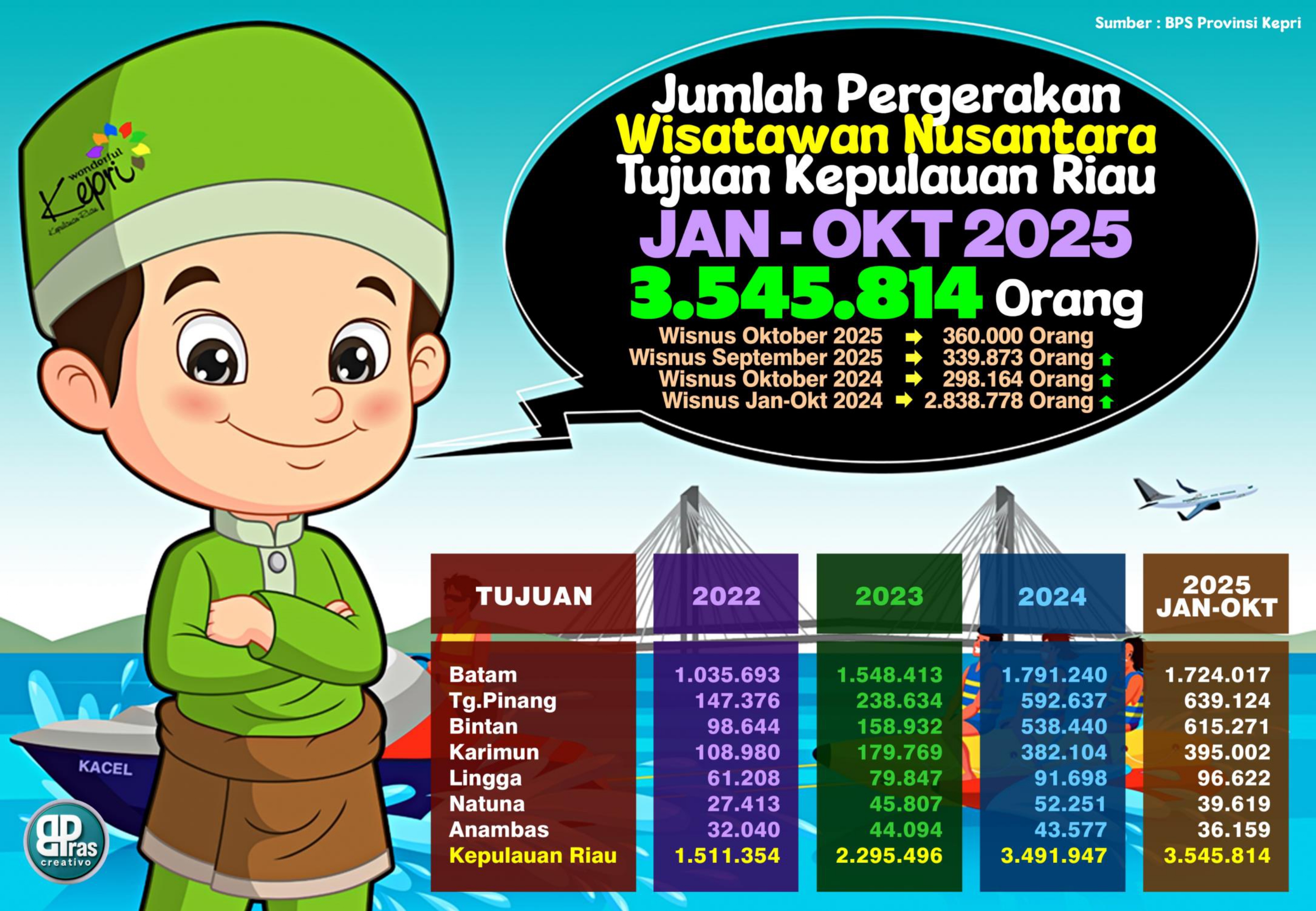 Bukan hanya wisman, sektor pariwisata domestik juga menunjukkan geliat luar biasa. Secara kumulatif dari Januari hingga Oktober 2025, perjalanan wisatawan nusantara (wisnus) ke Kepulauan Riau telah mencapai 3.545,81 ribu perjalanan. Jumlah ini melesat 24,91 persen dibandingkan periode yang sama tahun 2024. Kota Batam tercatat sebagai kota dengan jumlah perjalanan wisnus tertinggi, baik sebagai daerah asal perjalanan maupun sebagai daerah tujuan.
